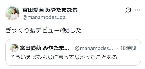元日向坂46で小説家、タレントの宮田愛萌(27)が10日までに、自身のX(旧ツイッター)を更新。“ぎっくり腰デビュー”を果たしたと告白した。