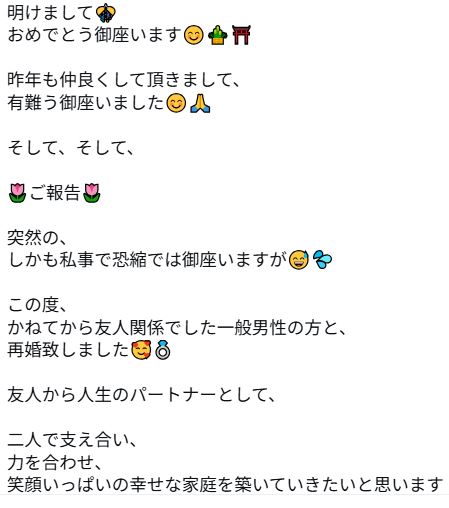 佑希は新年のあいさつに続き「そして、そして、ご報告」とつづり、「突然の、しかも私事で恐縮では御座いますが この度、かねてから友人関係でした一般男性の方と、再婚致しました」と報告した。
