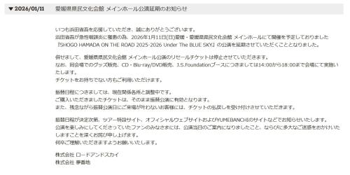 公式サイトでは「浜田省吾が急性咽頭炎に罹患の為、2026年1月11日(日)愛媛・愛媛県県民文化会館メインホールにて開催を予定しておりました『SHOGO HAMADA ON THE ROAD 2025-2026 Under The BLUE SKY』の公演を延期させていただくこととなりました」と報告。