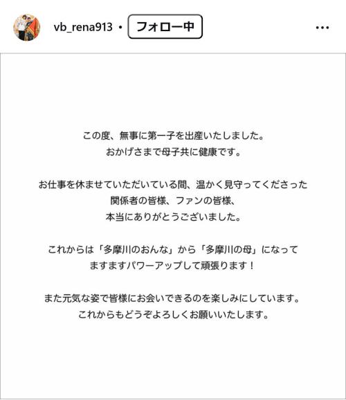 この投稿にフォロワーからは「レナちゃんがお母さん… まずは何よりも体を大事になさってください」「母子共に健康で良かった。幸多い日を願っております」「どうか気張らずに育児を楽しんで下さい」と祝福のコメントが寄せられている。