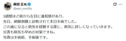 気象予報士の森田正光氏(75)が3日夜、自身のX更新。網膜剥離の手術を受けたと明かした。