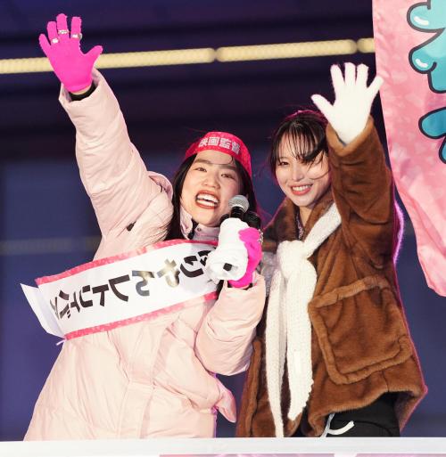 南は、1月28日に同じ東京・新宿の歌舞伎町で行われた公開直前! 大演説会に出席。雪が降る可能性も報じられた同日は、気温6度で強い風が吹く中、ゆりやんが「禍禍女カー」と題した街宣車で登場し、前日1月27日公示の衆院選の立候補者ばりに、、前田旺志郎(25)、鈴木福(21)、本島純政(21)、田中麗奈(45)含めた出演者と「頑張ろう! 頑張ろう! 頑張ろう!」「アカデミー賞! アカデミー賞! アカデミー賞! 取るぞ!」などと叫んだ。イベントは、午後6時から1時間超、屋外で続き、ゆりやんのNSC吉本総合芸能学院の同期で、出演もしている九条ジョー(32)が、ゆりやんに「本当に真剣なのか?」「ふざけただろ」などとヤジを飛ばすほどの冷え込みだった。