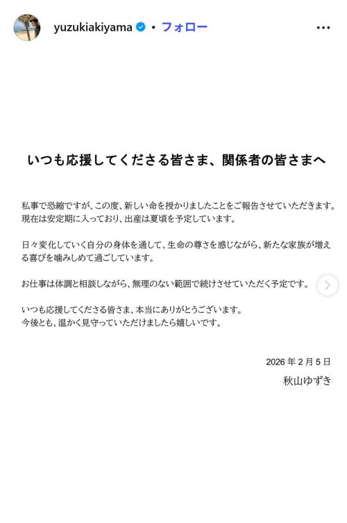 「現在は安定期に入っており、出産は夏頃を予定しています」とした。秋山は、ちょうど2カ月前の25年12月6日にインスタグラムで、一般男性と結婚したことを発表したばかりだった。「日々変化していく自分の身体を通して、生命の尊さを感じながら、新たな家族が増える喜びを噛みしめて過ごしています。お仕事は体調と相談しながら、無理のない範囲で続けさせていただく予定です」とした。