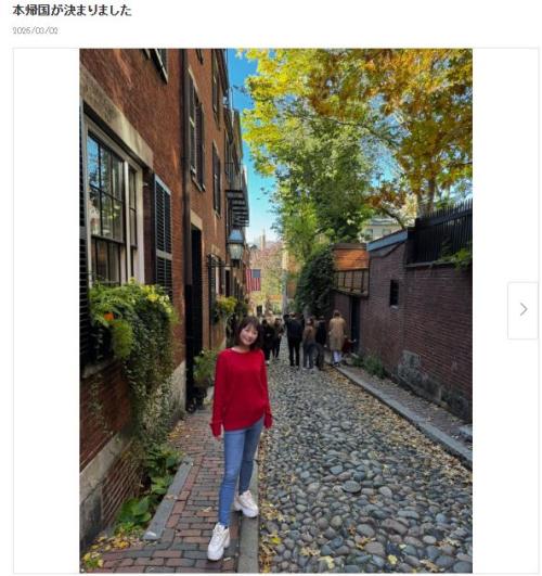 2018年に結婚した夫とともに米国に移住し、当時は初めての海外暮らしで不安だったが「ボストンでの生活が心地よく、スイートホームになりました」という。「文化や言葉の違い。日本ではあり得ないようなトラブルがあり得ないタイミングであり得ちゃう日々笑 いいことばっかりじゃないし、罵詈雑言も吐いてたよ」と回想。渡米の翌年には第1子男児を出産し、異国の地での初めての子育て、産後のメンタル不調も経験。新型コロナウイルス拡大による困難なども乗り越え「どれも私の人生の中で間違いなく大きな糧となった」とつづった。