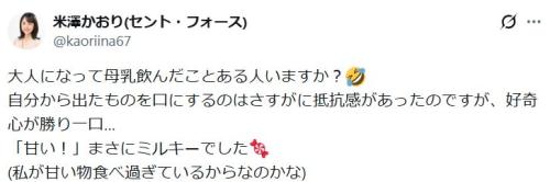 芸能事務所「セント・フォース」所属のフリーアナ米澤かおり(35)が、3日までにXを更新。自身の母乳を飲んだと明かした。