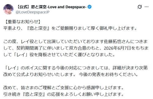 スマートフォン向けゲームアプリ「恋と深空-Love and Deepspace-」の公式Xアカウントが3日までに更新され、登場キャラクター、レイ役の声を担当した声優佐藤拓也の降板を発表した。