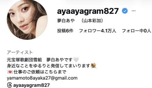 2月22日に宝塚を退団した元雪組トップ娘役で女優の夢白(ゆめしろ)あや(本名山本彩加)が、このほどインスタグラムを開設。退団翌日から4日までに、既に4万人以上のフォロワーを集めている。