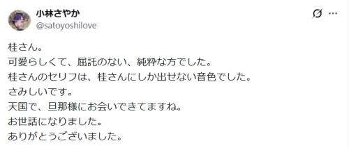 小林は「桂さん。可愛らしくて、屈託のない、純粋な方でした。桂さんのセリフは、桂さんにしか出せない音色でした」と明かし、「さみしいです」と吐露。