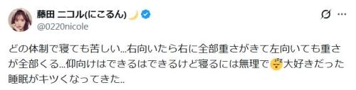 藤田は「どの体制で寝ても苦しい…右向いたら右に全部重さがきて左向いても重さが全部くる…仰向けはできるはできるけど寝るには無理で」とおなかが大きくなったことによる苦労を吐露。「大好きだった睡眠がキツくなってきた…」と悲しげに記した。