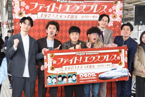 お笑いコンビ、たくろう(赤木裕=34、きむらバンド=36)、ツートライブ(たかのり=41、周平魂=42)、カベポスター(永見大吾=36、浜田順平=38)が9日、JR新大阪駅で「ファイト!エクスプレス~上京芸人と笑って出発~」セレモニーに出席し、午前9時51分発の「のぞみ346号」で上京した。