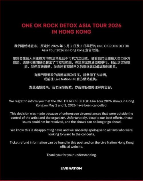 公式アカウントでは英文で「2026年5月2日、3日のONE OK ROCK DETOX Asia Tour 2026香港公演は中止となりましたのでお知らせいたします」と発表された。