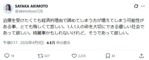 秋元は「治療を受けたくても経済的理由で諦めてしまう方が増えてしまう可能性がある事、とても悔しくて悲しい」と吐露。「1人1人の命を大切にできる優しい社会であって欲しい。綺麗事かもしれないけれど、そうであって欲しい」と訴えた。