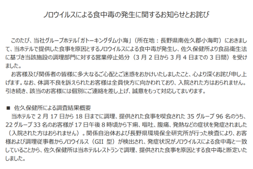 県の健康福祉部によると、先月17~18日『ガトーキングダム小海』内のレストランで食事をした男女33人がおう吐、下痢、発熱、腹痛などを発症した。