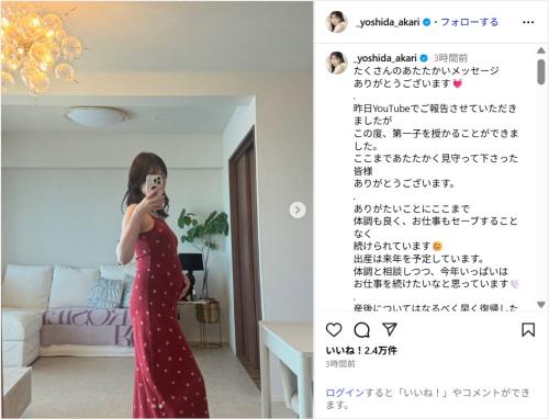 吉田は「たくさんのあたたかいメッセージ ありがとうございます 昨日YouTubeでご報告させていただきましたが この度、第一子を授かることができました。ここまであたたかく見守って下さった皆様 ありがとうございます」と報告。続けて「ありがたいことにここまで 体調も良く、お仕事もセーブすることなく続けられています 出産は来年を予定しています。体調と相談しつつ、今年いっぱいはお仕事を続けたいなと思っています」と伝えた。