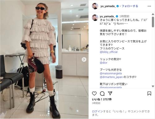 山田は「きゅうに寒くなってきましたね」と書き出し、写真を投稿。サングラスをかけて、フリルデザインがお洒落な白のミニ丈ワンピース、黒のブーツ、黒のリュックを合わせたコーディネートを披露し、「体調を崩しやすい気候なので、皆様お気をつけ下さいませ!」「お気に入りのワンピースで気分を上げてきます」とつづった。