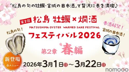 松島 牡蠣と燗酒フェスティバル実行委員会は、日本三景 松島(会場:宮城県松島離宮)で「松島 牡蠣と燗酒フェスティバル“第2章 春編”」を、2026年3月1日(日)より開始していることを発表しました。