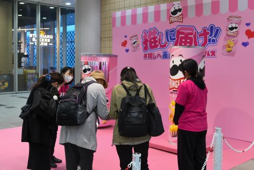 10月23日から11月4日まで「#推しへ差し入れプリングルズ」キャンペーンを展開したプリングルズが、11月3日と4日の二日間、東京・渋谷のマークシティ渋谷でポップアップイベントを開催した。本キャンペーンは、SNSに”推し”の応援メッセージを投稿すると、投稿数上位の所属事務所に「プリングルズ バターキャラメル」が差し入れされるというユニークな企画だ。スイート系フレーバーをイメージしたピンクのパッケージカラーで染まった会場には投稿用の特設ポストが登場し、自分の推しに”甘い一票”を投じる人々の熱気に沸いた。
