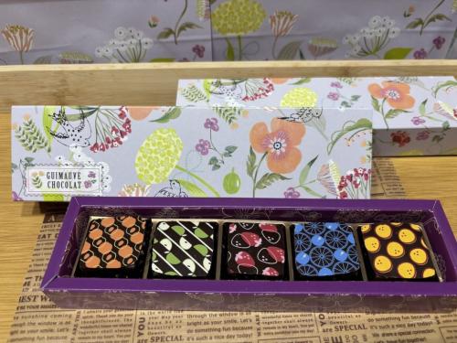 味はアプリコット・青リンゴ・苺・ライム・パッションの5種類。フルーツ果汁を凝縮させた香り高いギモーヴがフルーツ柄のかわいいチョコレートでコーティングされている。一口食べるとパリッとしたチョコレートとふわふわのギモーヴとの食感がなんとも絶妙で、くせになるおいしさだ。