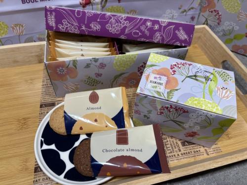 沖縄産のさとうきびの原料糖のみで作られた「本和香糖」を使用した口当たりが良く、まろやかな甘さにサクッとした食感が特徴のクッキー。味はアーモンドのやわらかな香りが口いっぱいに広がる“アーモンド”と、ほろ苦いチョコレートとアーモンドの風味が際立つ“チョコアーモンド”の2種類で、どちらもアーモンドの食感が良いアクセントになっている。