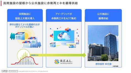 一方、堺市は、国の脱炭素先行地域として選定され「堺エネルギー地産地消プロジェクト」を推進している。その一環として実施された「堺市版オフサイトPPA事業」において、アイ・グリッドが採択された。アイ・グリッドはこの採択を受け、市内複数サイトの発電所の余剰電力をアグリゲーション(集約)し、系統を通じて需要家へ小売供給を実施。地域で作られた電力を自治体に供給する仕組み「堺モデル」が本格始動することとなった。