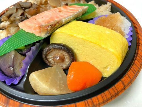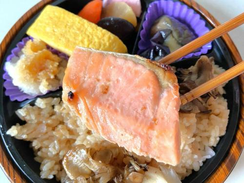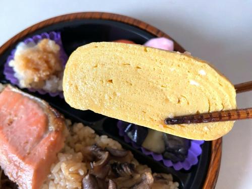 この時期にぴったりの鮭やきのこなども入って、季節を感じる見た目も楽しめるお弁当です。