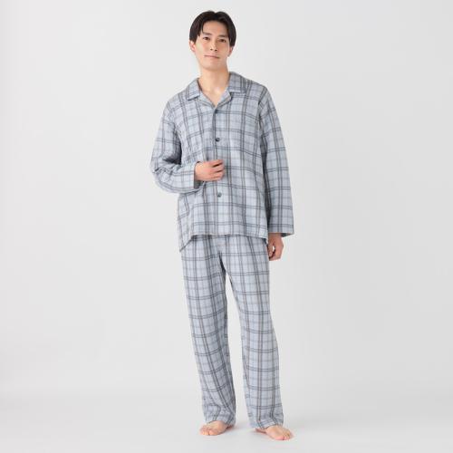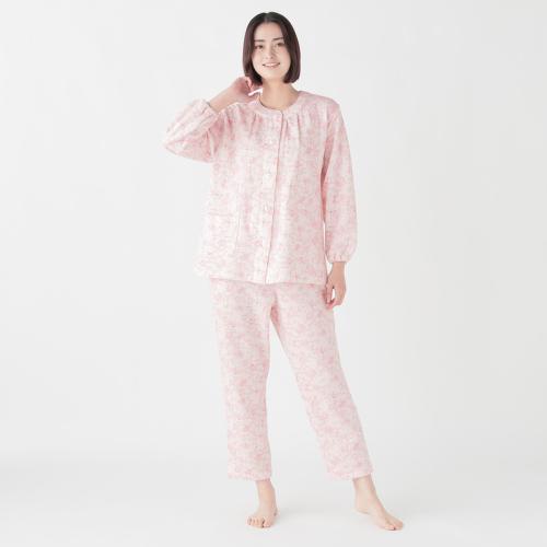 留め外しが容易な大きめのボタンや斜めのボタンホールといった仕様が特徴で、ゆったりと着用できる快適なパジャマです。