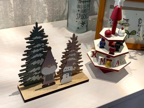 木材で作られており、見ているだけで冬のぬくもりを感じられるのも大きな魅力!木の前にサンタと雪だるまが並んでいる構図も、小さなクリスマス物語みたいでほのぼのします♪