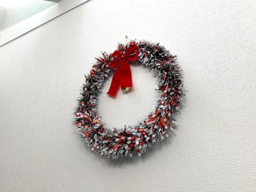 リースに紐が付いていたので、そのまま部屋の中の壁に掛けてみました!ホワイトのシンプルな壁でしたが、色鮮やかなリースひとつで空間が一気にクリスマスムードに変わります♪