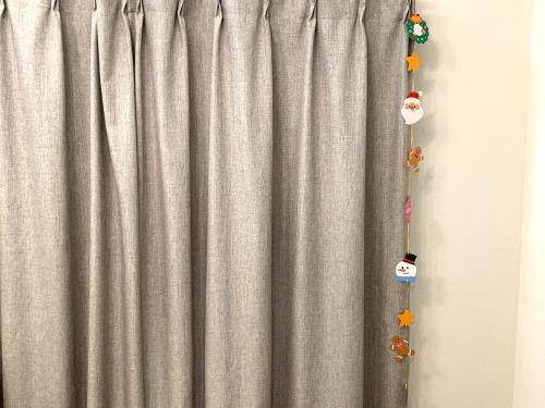 付属の紐を通し、カーテンの横に吊るしてみました。複数の飾りを通しても非常に軽いガーランドなので、テープで楽々固定できましたよ♪