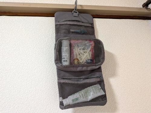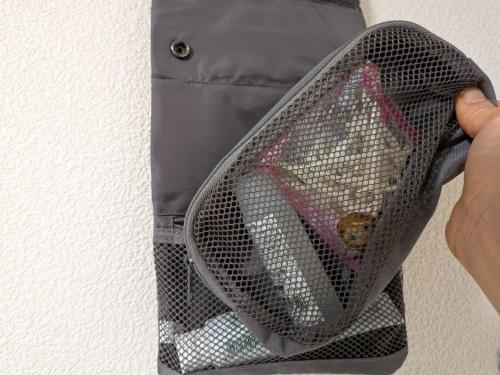 真ん中部分のポーチは、取り外しが可能。家でも旅行でも共通して使うものをここに入れておくと、外してそのまま旅行へ持っていけたり、丸ごと持って行って、洗面台付近に吊るしておけたりと便利です!