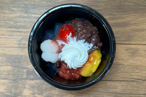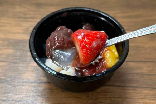 コリコリとした寒天の食感やもちっとした白玉風団子に加え、粒餡やホイップクリーム、甘酸っぱい苺のハーモニーを楽しめる一品です。