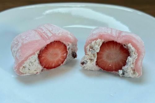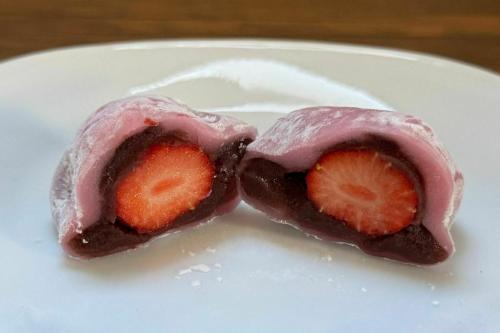 苺が生地に覆われた一般的ないちご大福と比べて、苺が表に出ている分よりはっきりといちご感を味わえます。