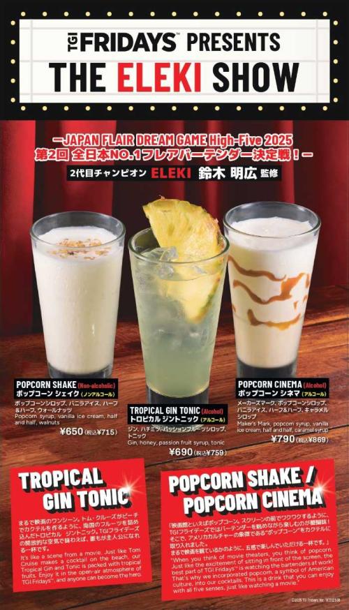 TGIフライデーズでは、全日本No.1フレアバーテンダー決定戦『JAPAN FLAIR DREAM GAME High-Five 2025』優勝者、鈴木明広(ELEKI)監修のオリジナルドリンクを、2025年9月16日(火)~30日(火)までの期間限定で国内全13店舗にて販売♡ トロピカルジントニックやポップコーンを使ったユニークなカクテルで、映画のようなワクワク感をお楽しみいただけます♪