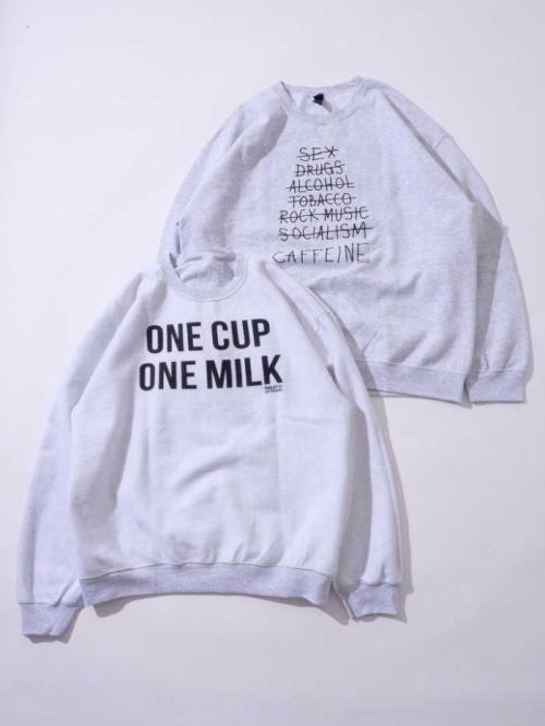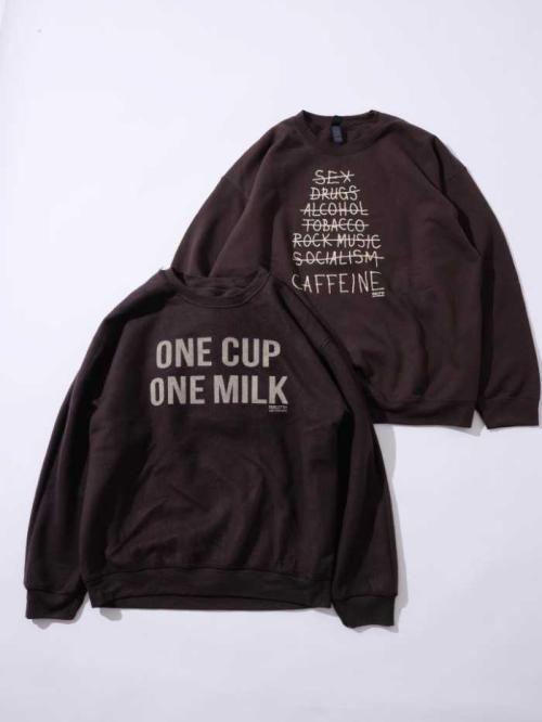 「CAFFEINE ONE CUP ダブルサイド クルースウェットシャツ」(17,600円)は、GREYとDK BROWNの2色展開(S~XL)。