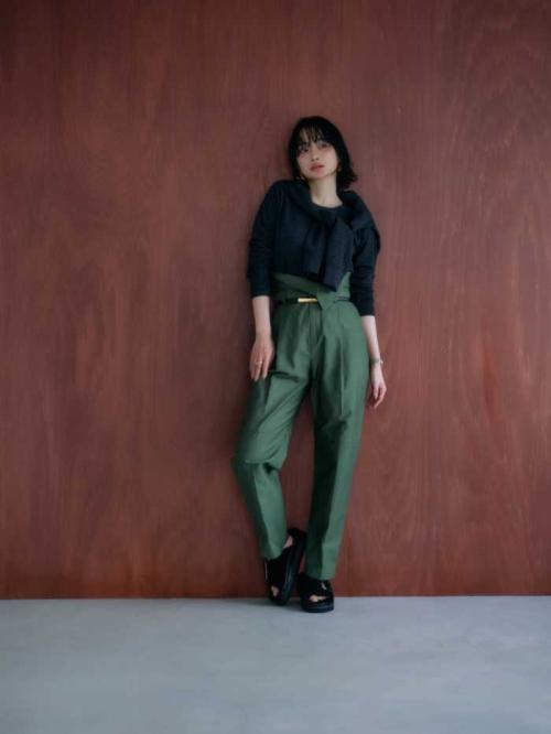 24,200円(税込)のパンツは、ワンタック入りテーパードで脚長効果も◎。フェイクレザー(ブラック)とチノ素材(ベージュ・カーキ)の2素材を用意。