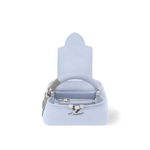 まず注目したいのは「カプシーヌ MINI」(1,034,000円)。上品なフローズンブルーのトリヨンレザーを採用し、ハンドルにはチェーン装飾、サイドにはチャームが煌めくデザイン。
