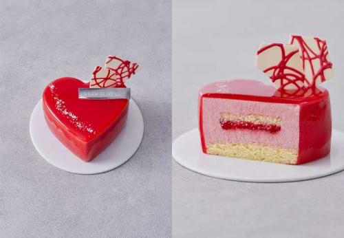 3号サイズの「ベリークリスマスハート」は、ひとめでときめくルビー色のフランボアケーキ。中には香り豊かなダブルベリームースを閉じ込め、甘酸っぱい苺ピューレとフランボワーズの華やかさを融合。