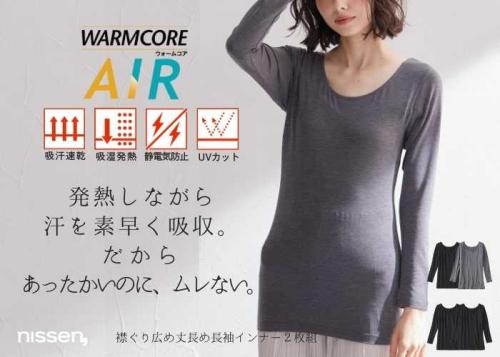 暑がりさんの冬インナー 襟ぐり広め丈長め長袖インナー2枚組(吸湿発熱・吸汗速乾・UVカット・静電防止)ウォームコアAIR