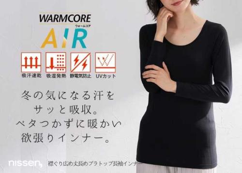『ウォームコアエアー』は、発熱しながらも汗をすばやく吸収・発散し、冬の寒暖差にも快適に対応する高機能インナー。静電気防止機能や薄手の軽やかな素材で、重ね着してもすっきりとした印象に。