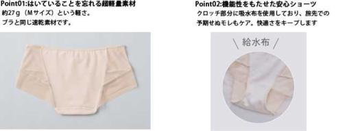 長期の旅行や出張でも数枚あれば十分に対応できるのが嬉しいポイント。またショーツのクロッチ部分には吸水布を使用し、予期せぬモレにも対応。