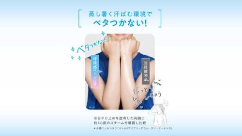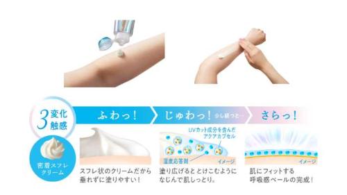 蒸し暑い屋外では汗を吸収してベタつきを防ぎ、エアコンの効いた室内では水分を放出して乾燥を防ぎます。環境変化の大きい現代の生活に寄り添う、新しい日やけ止めの形です。