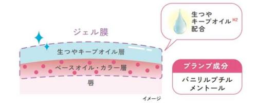 ジェル膜処方により、塗布後約3分でジェル膜が完成。生つやキープオイル※2がカラー層を守り、塗りたての発色と膜厚感のあるツヤを長時間キープします。