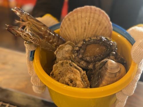 オーダーすると、バケツなどにドカンっと豪快に盛り付けられた魚介類は、牡蠣・アワビ・ハマグリ・車海老、海鮮BBQのスタートです。
