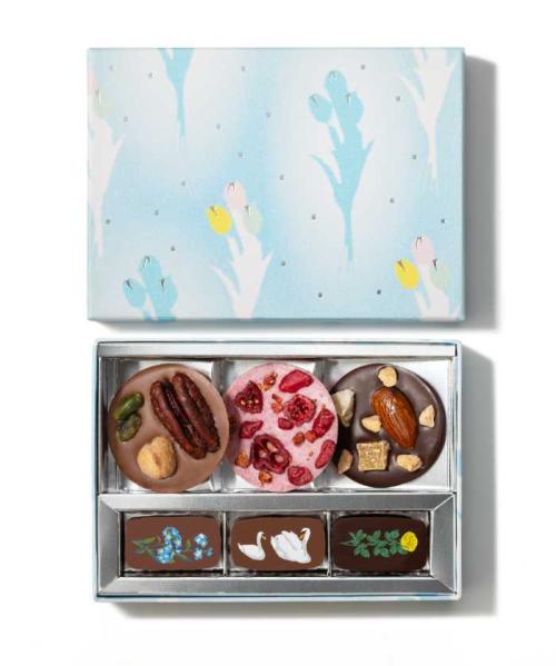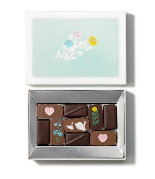 ハートやお花をプリントした6種類のチョコレートを詰め合わせ、ローズやカモミール、ベリーの香りが広がります。