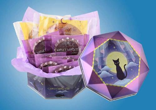 「月影猫のミラージュ缶(8個入)」は1,300円(税込1,404円)。神秘的な黒猫が印象的な宝石箱風の缶に、焼菓子2種を詰め合わせています。