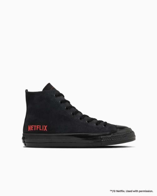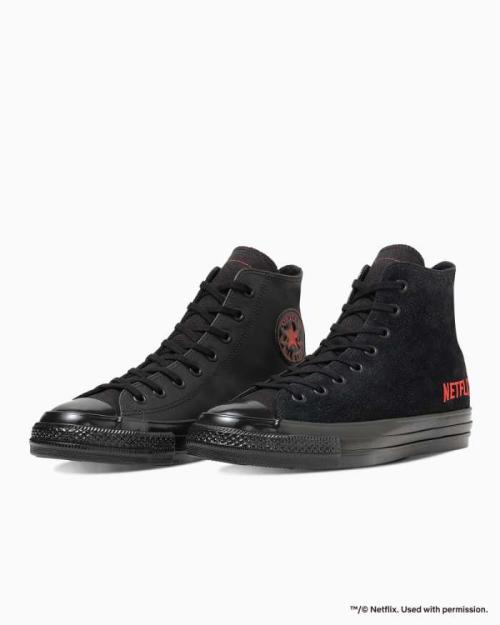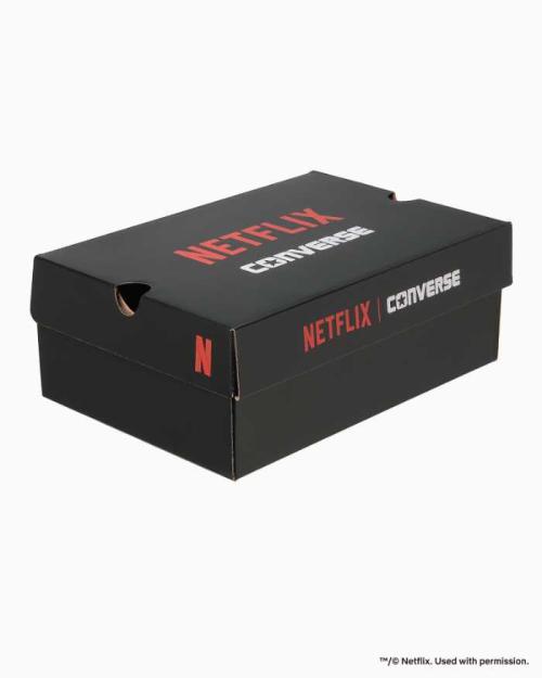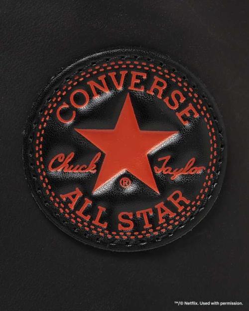 外腰にはNetflixロゴの刺しゅうを施し、オールスターを象徴するロゴマークもブラック×レッドにアレンジされています。