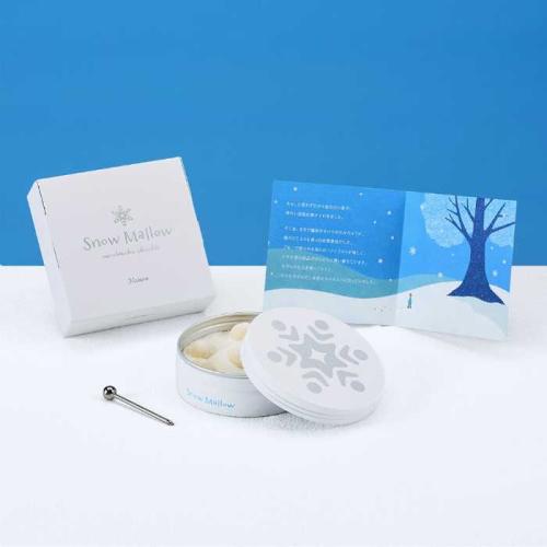スノーマロウは、雪景色を思わせるスノーマロウ缶に詰めて届けられます。内容はチョコがけマシュマロ79g(約11粒)とチョコレートパウダー36g、合計内容量115g。