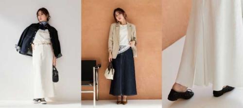 ベイカーストレートデニムはサイズXXS/XS/S/M、バックタックデニムスカートはXS/S展開。きれいめトップスと合わせれば大人っぽく、カジュアルアイテムと合わせれば抜け感のある着こなしに。