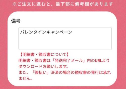【公式通販サイト】では、①1回の注文金額合計5,500円(税込)以上、②備考欄に「バレンタインキャンペーン」と記入、の条件達成でラッピング巾着をプレゼント。