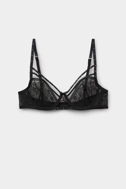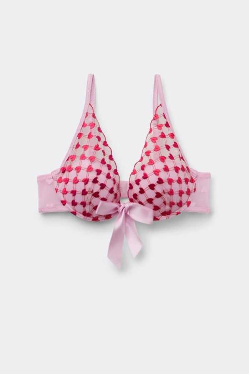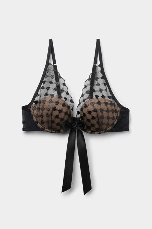 ハート刺繍入りチュールとサテンディテールがロマンチックな一枚。取り外し可能なサテンリボンはチョーカーとしても使用でき、バストをしっかり支える設計です。